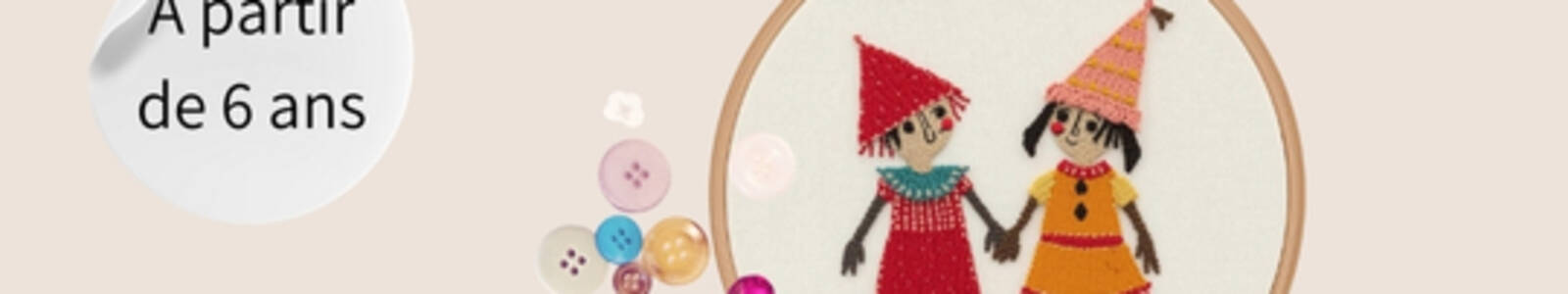 Clowns et acrobates inspireront la réalisation d’une création en tissu mêlant peinture, broderie et couture. Les enfants découvriront les bases du travail textile : aiguille, fils colorés, boutons, tissus… et réaliseront un joli tableau en techniques mixtes.