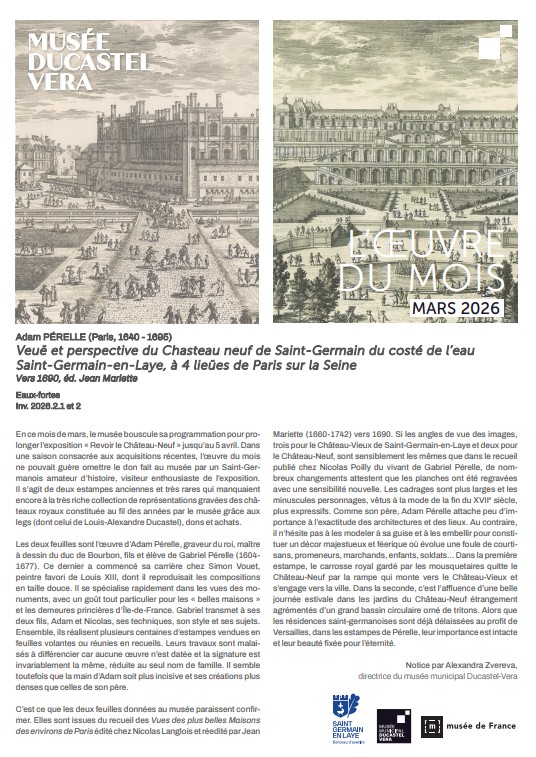 En mars, deux estampes rares réalisées vers 1690 par le graveur Adam Pérelle sont à l’honneur. Ces vues du Château-Neuf de Saint-Germain-en-Laye, récemment données au musée par un amateur d’histoire saint-germanois, viennent enrichir la remarquable collection de gravures consacrées aux châteaux royaux conservée par le musée.